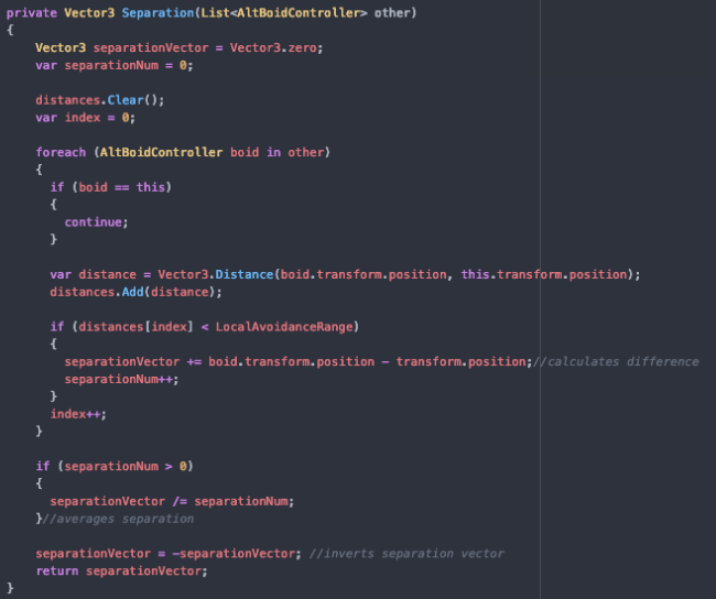 The separation function iterates through the list of boids in the scene and checks the distance between each boid, these values are stores in a separate list. If a specific distance value is less than the LocalAvoidanceRange, it calculates the average vector position and adjusts the separation vector to be inverted. The lower the LocalAvoidanceRange the denser the group will be.