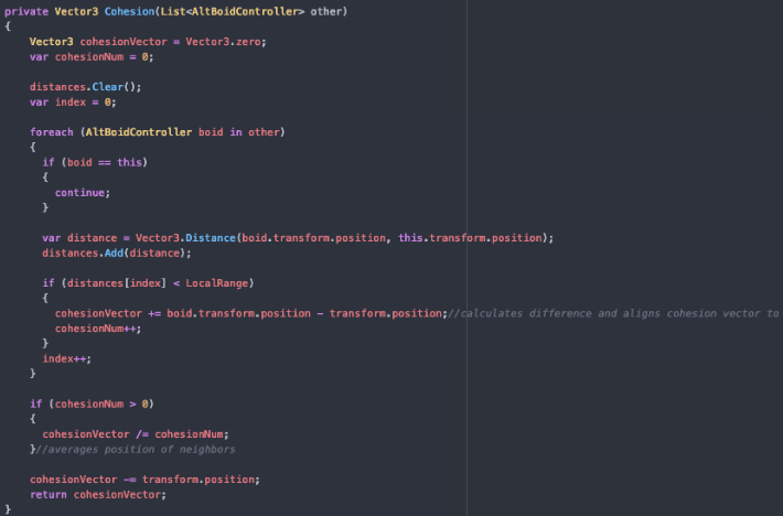 The cohesion function iterates through the list of boids in the scene and checks the distance between each boid, these values are stores in a separate list. If a specific distance value is less than the LocalRange, it calculates the average vector position and adjust the cohesion vector towards that position. The larger the LocalRange value the larger the group will be, the larger area each boid influences one another.